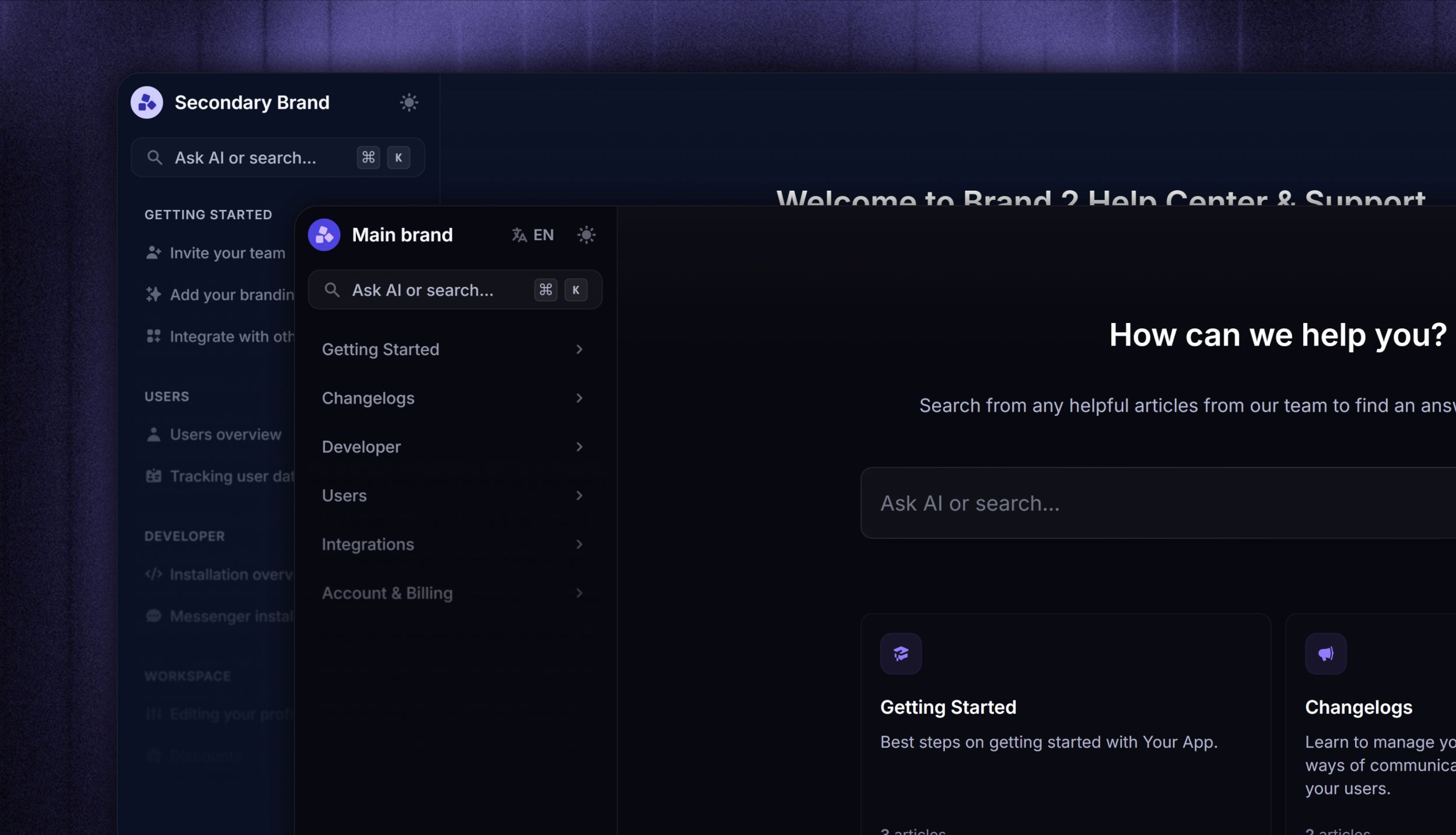 Multi-brand support lets you create separate Messenger styles and Help Centers for each brand, while keeping your support operations centralized.