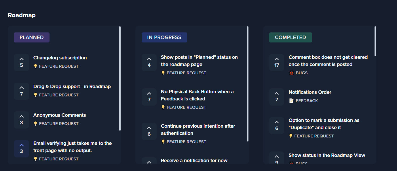 You can now select which statuses(like 'In Review', 'In Progress') you wish to show in your Roadmap. For example, if you wish to show Planned features, simply navigate to your Dashboard -> Settings -> Roadmap Settings and select the "Planned Submissions" checkbox..