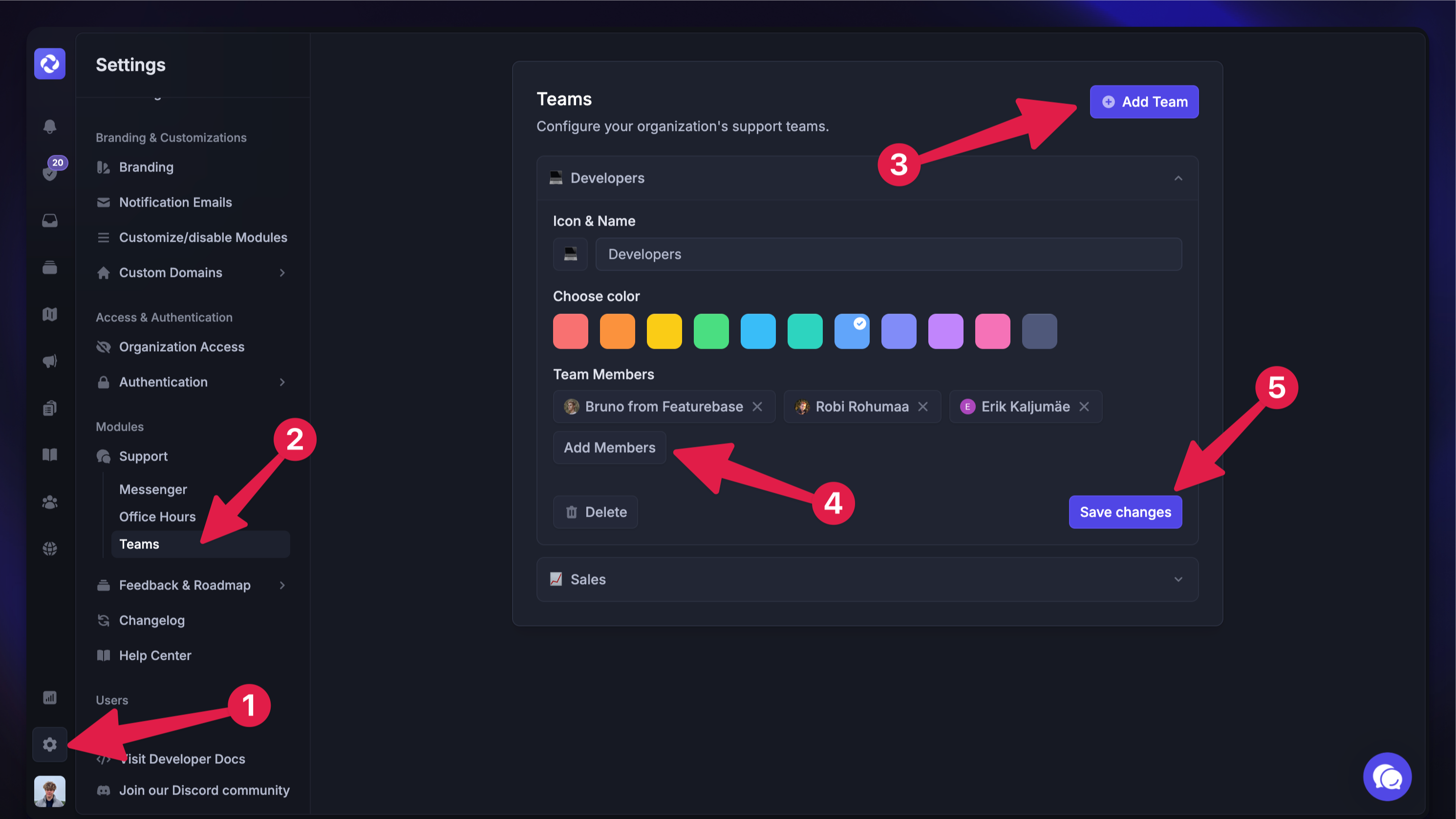 + Add Teamfrom the top rightChoose the icon, name, and color for the team (the icon or emoji is seen only in Featurebase Inbox – your users will never see it)