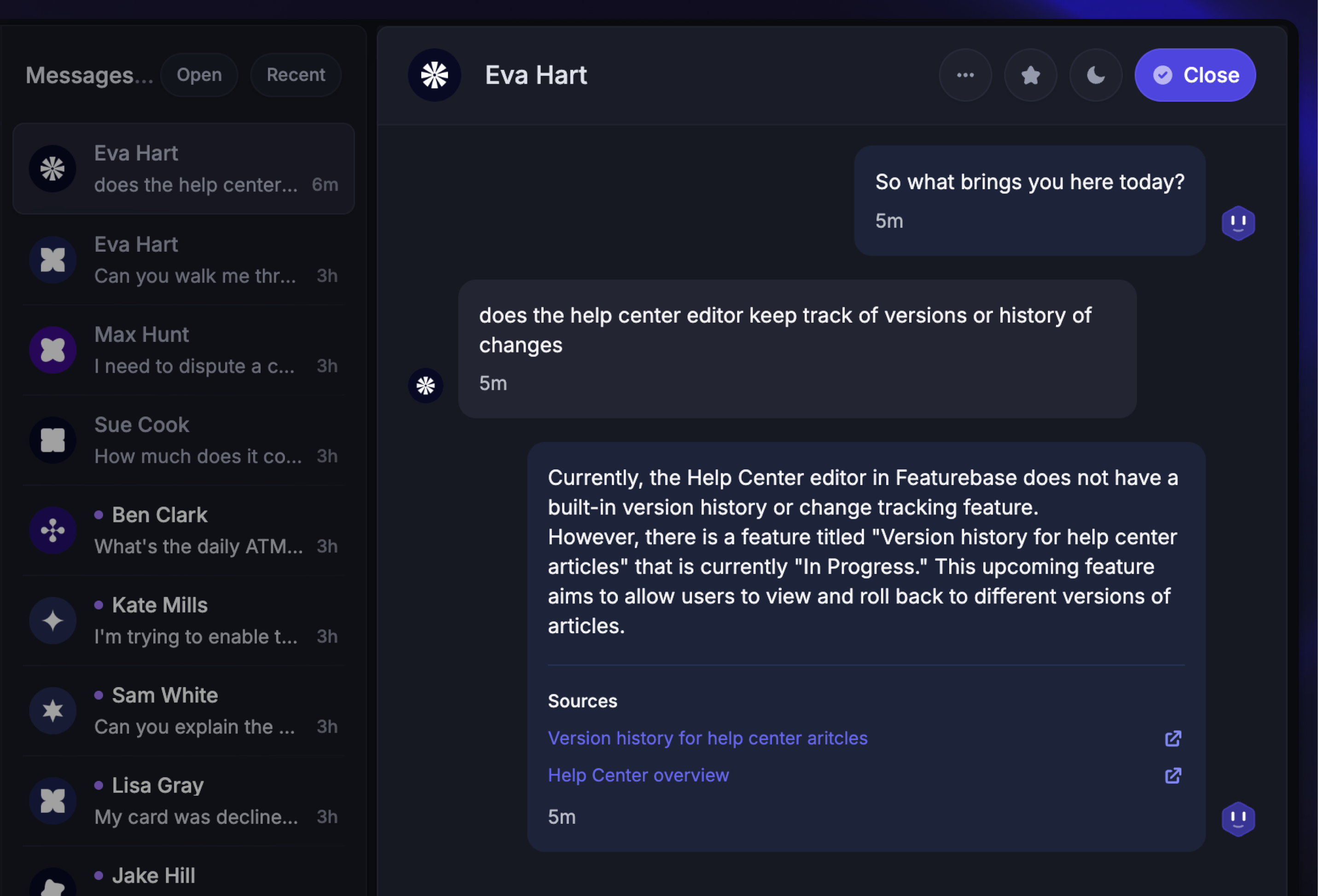 In addition to learning from your existing conversations, Fibi has full context from your entire Featurebase workspace: Help Center articles, customer requests, changelogs, roadmaps, and more. That means it knows which features are live, which bugs are already reported, and what updates are coming – so every reply is accurate, relevant, and actually helpful.