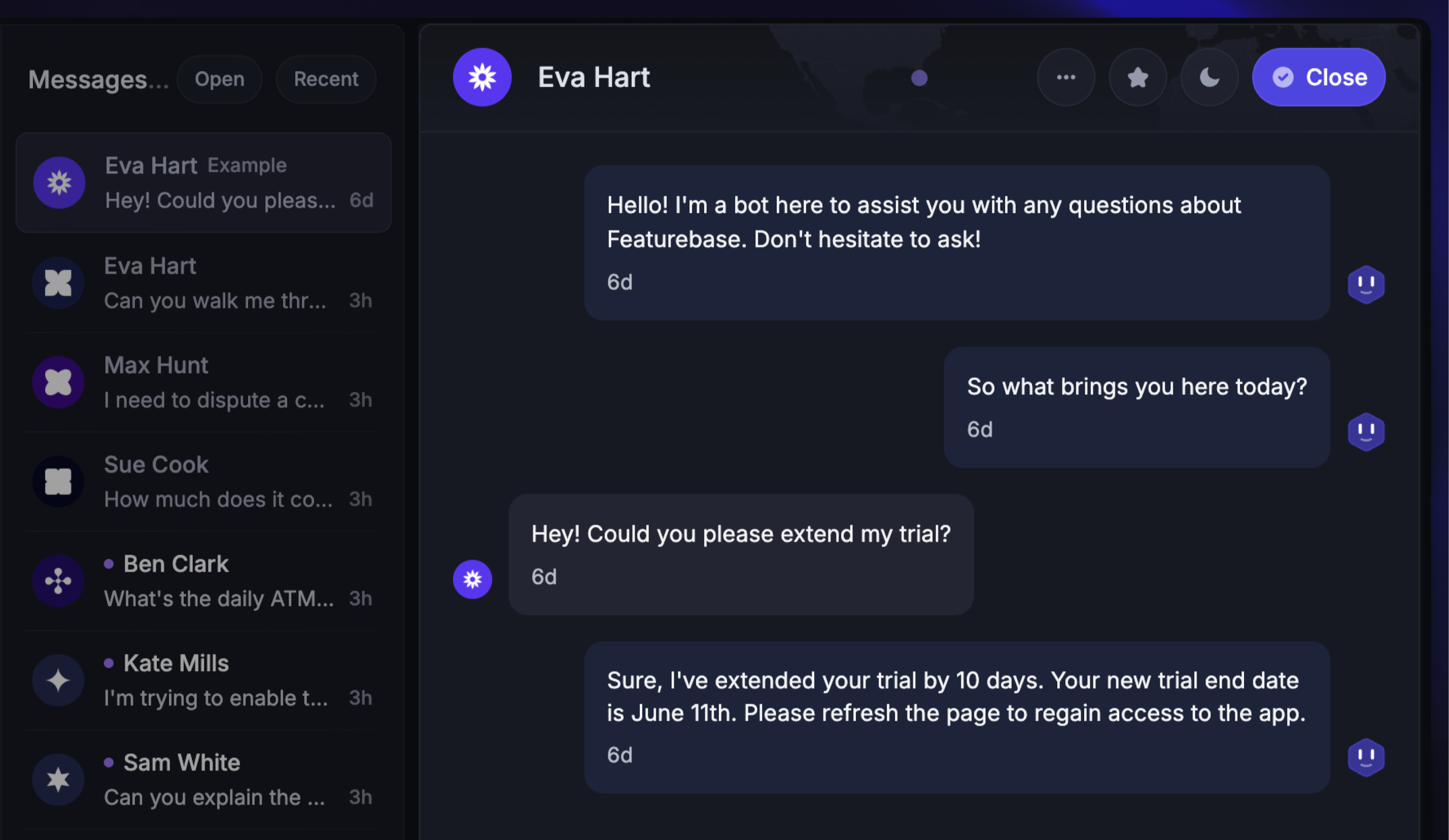Featurebase’s Support platform comes with the Fibi AI Agent, who can automatically resolve customer questions, submit feedback to voting boards on their behalf, and run custom workflows like extending trials, offering discounts, and much more – all without you lifting a finger.