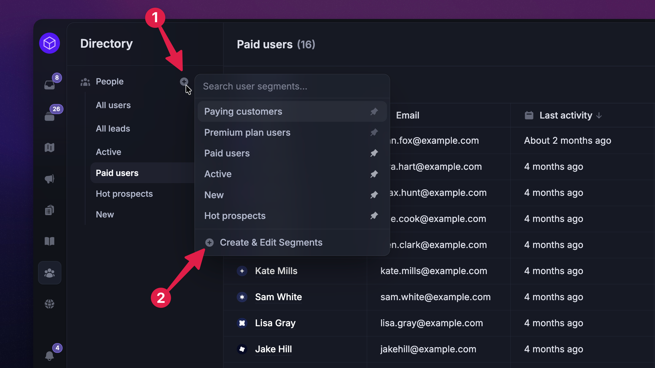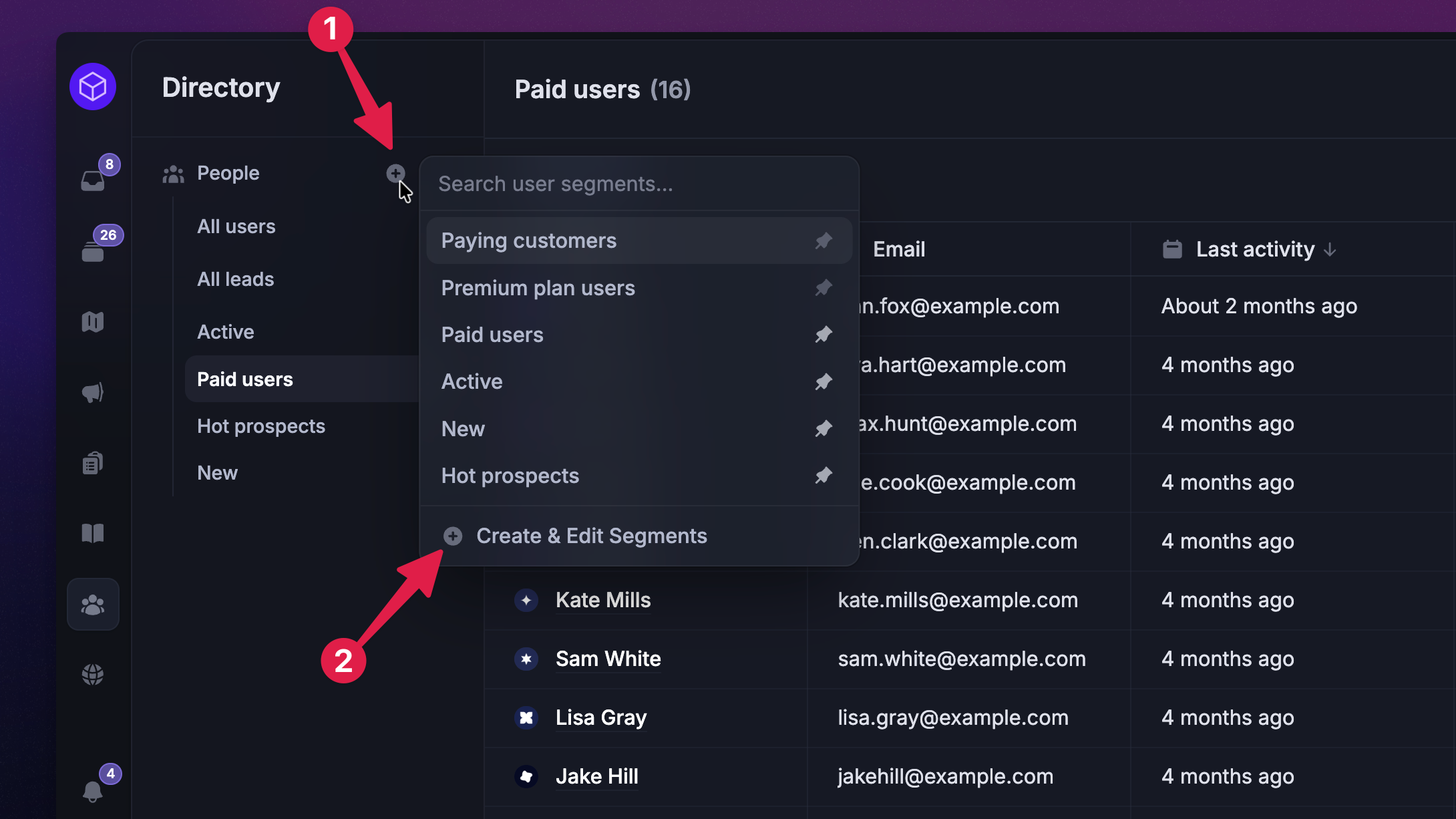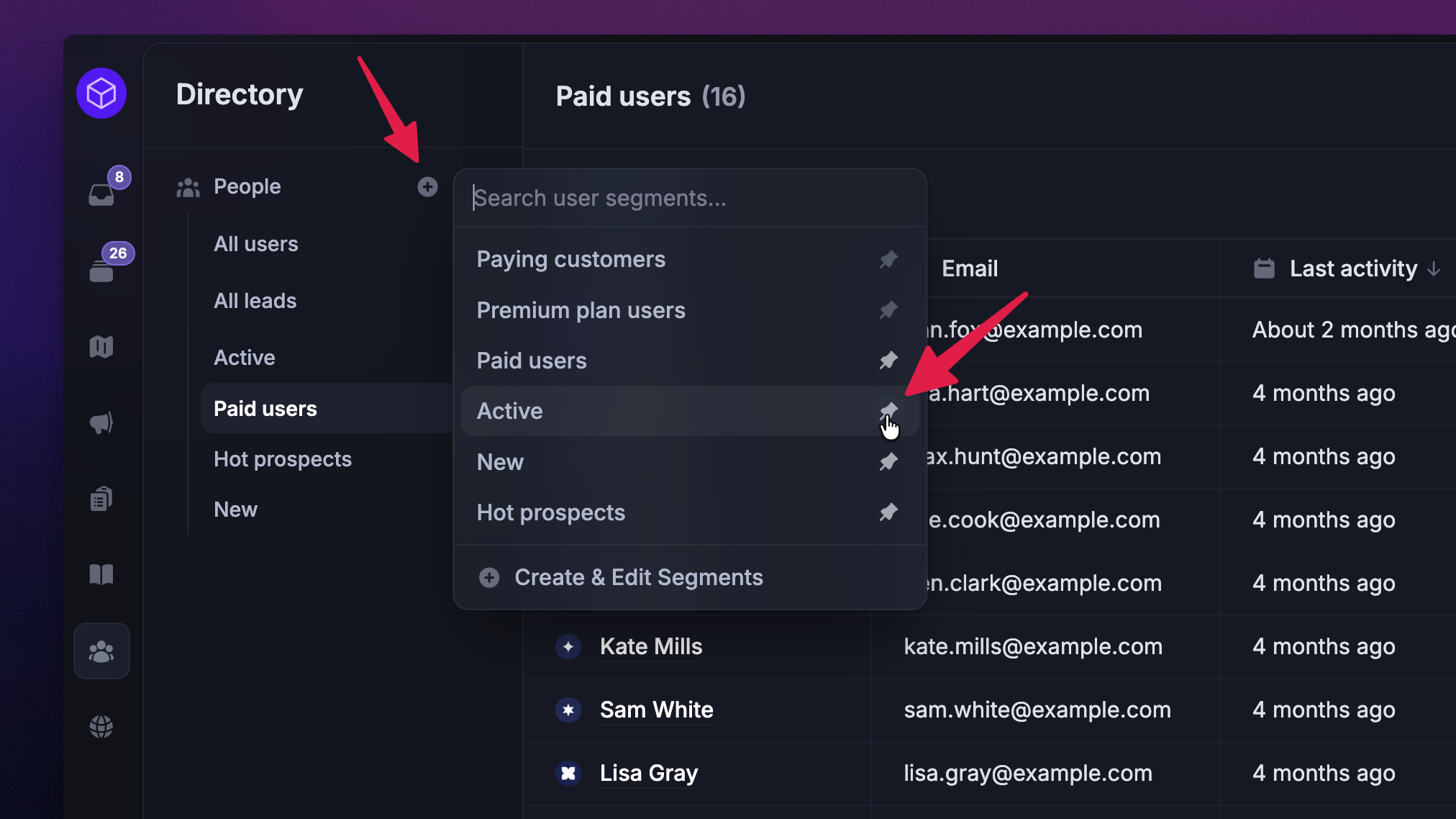 For example, you could create a segment of trial users and send them onboarding messages, or you could create a segment of hot prospects, loyal customers, etc.