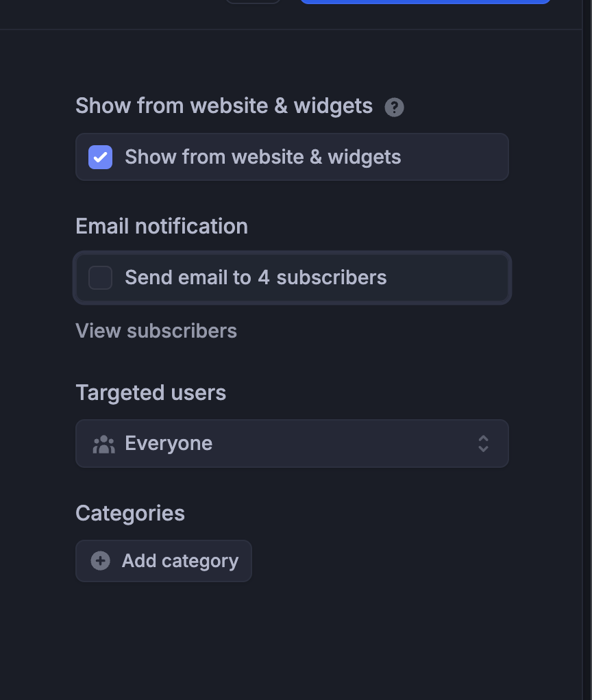 I don’t want to automatically send emails to many subscribers (although we only have 4 subscribers, it’s behind the feature flag right now), so I always have to remember to uncheck this option.